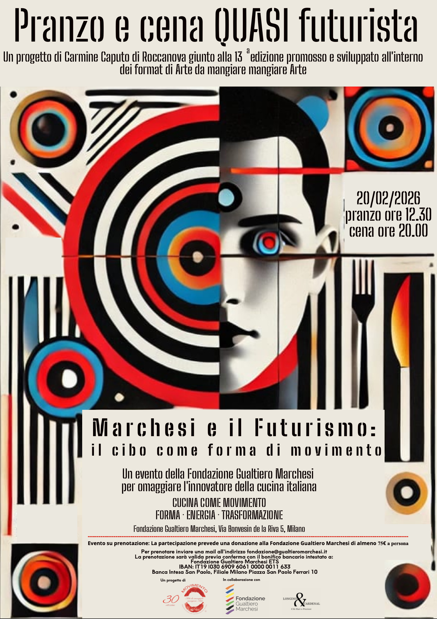 Il 20 febbraio 2026, in occasione del 117° anniversario della pubblicazione del Manifesto Futurista di Filippo Tommaso Marinetti su Le Figaro (20 febbraio 1909) e del 150° anniversario della nascita del fondatore del Futurismo, la Fondazione Gualtiero Marchesi ospiterà un evento gastronomico-culturale nato dalla collaborazione prestigiosa tra l'Associazione culturale e Movimento di Pensiero Arte da mangiare mangiare Arte e la Fondazione Gualtiero Marchesi. Si tratta del primo Pranzo quasi futurista e la tredicesima edizione della celebre Cena quasi futurista, progetto artistico performativo ideato dall'artista Carmine Caputo di Roccanova e sviluppati all'interno delle proposte artistico-culturali di Arte da mangiare mangiare Arte in collaborazione con la Galleria Scoglio di Quarto.
